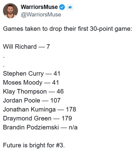 這也是他生涯第7場(chǎng)比賽,作為對(duì)比,庫里和穆迪都是在各自生涯的第41場(chǎng)比賽才拿到第一個(gè)30+;克萊是第46場(chǎng)、普爾則是第107場(chǎng);