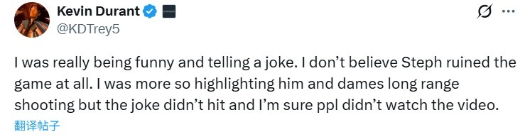 杜蘭特在推特與網(wǎng)友互動時解釋道:“我其實是在開玩笑、講個梗,我根本不覺得斯蒂芬毀了全明星(I don’t believe S teph ruined the game at all),我更多是想強調(diào)他和利拉德的超遠(yuǎn)投射能力,但梗沒響,而且我猜很多人根本沒看視頻?!?/p>