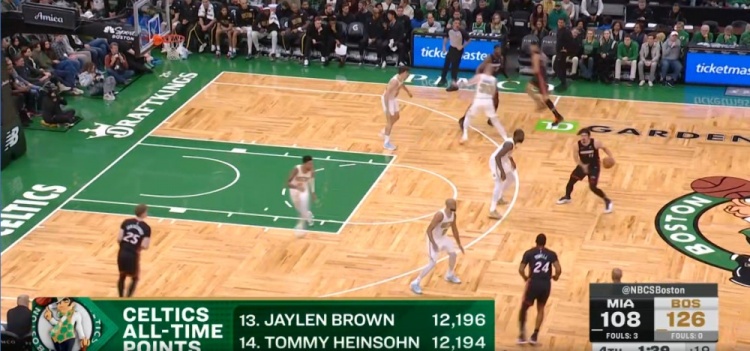 第四節(jié)比賽,杰倫·布朗通過上籃得到個(gè)人本場(chǎng)第30分,生涯總得分達(dá)到12196分,超越湯米·海因索恩,排名凱爾特人隊(duì)史第13位。