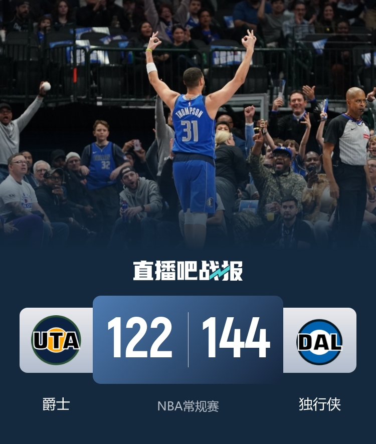 比賽開場(chǎng),雙方先是陷入拉鋸戰(zhàn),替補(bǔ)球員上場(chǎng)后爵士陷入得分荒,獨(dú)行俠這邊克萊外線手感火熱,登場(chǎng)后連續(xù)投中,幫助獨(dú)行俠領(lǐng)先到兩位數(shù),以35-24結(jié)束第一節(jié)。次節(jié)回來,獨(dú)行俠延續(xù)攻勢(shì),爵士一度將分差縮小到個(gè)位數(shù),但馬紹爾本節(jié)引領(lǐng)獨(dú)行俠進(jìn)攻幫助球隊(duì)穩(wěn)住領(lǐng)先優(yōu)勢(shì),半場(chǎng)結(jié)束獨(dú)行俠70-50大幅領(lǐng)先。易邊再戰(zhàn),獨(dú)行俠愈戰(zhàn)愈勇,籃下予取予求的同時(shí)外線也連續(xù)發(fā)炮,單節(jié)再轟下42分,三節(jié)結(jié)束112-79領(lǐng)先。末節(jié)回來,比賽已經(jīng)基本失去懸念,獨(dú)行俠穩(wěn)扎穩(wěn)打?qū)倮杖肽抑?,最終144-122輕取爵士。
