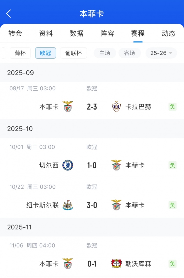 11月06日訊 歐冠聯(lián)賽階段第4輪,本菲卡主場(chǎng)0-1不敵勒沃庫(kù)森,本賽季歐冠4戰(zhàn)全負(fù),0分進(jìn)2球丟8球排倒數(shù)第二。