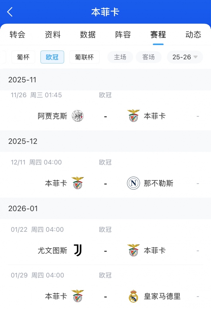 歐冠4輪比賽過(guò)后,本菲卡0分排名倒數(shù)第二,之后還將與墊底的阿賈克斯(客)、第24的那不勒斯(主)、第26的尤文(客)和第7的皇馬(主)交手,賽程難度拉滿。