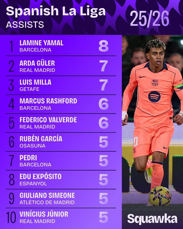 02月05日訊 截止西甲22輪,據(jù)Squawka統(tǒng)計(jì),亞馬爾在多項(xiàng)數(shù)據(jù)霸榜。