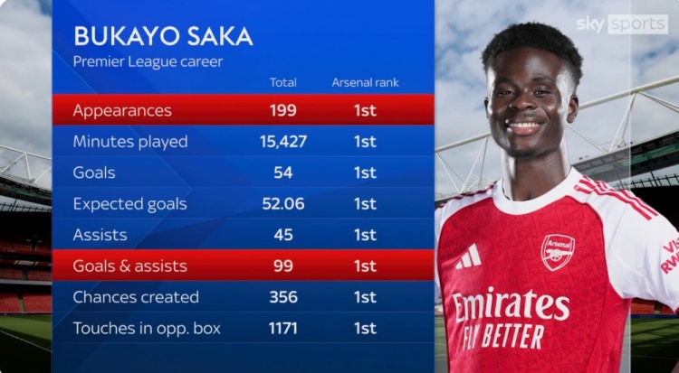 薩卡首秀以來阿森納隊(duì)內(nèi)居首的英超數(shù)據(jù):