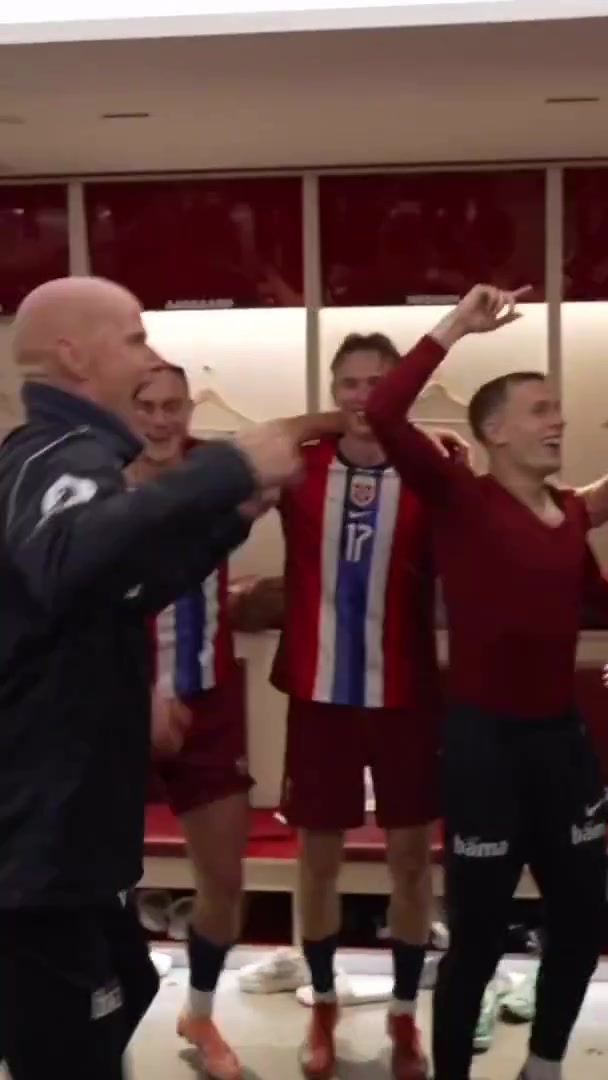 10月12日訊 本輪世預賽挪威5-0狂勝以色列,最快下輪可鎖定世界杯正賽門票,賽后挪威全隊在更衣室縱情慶祝,受傷的隊長厄德高只能坐在座位上和隊友一起嗨。