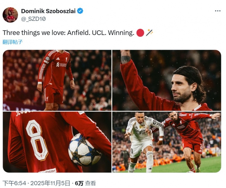 11月5日訊 歐冠聯(lián)賽階段第 4輪,利物浦主場(chǎng) 1-0戰(zhàn)勝皇馬。賽后,紅軍中場(chǎng)索博斯洛伊在社交媒體曬圖,慶祝球隊(duì)獲勝。