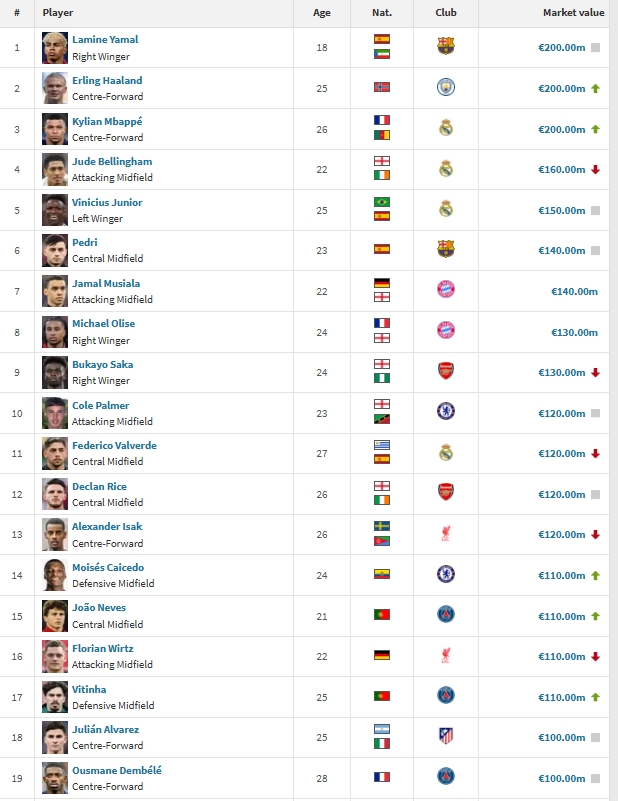 12月15日訊 德轉更新法甲球員身價,維蒂尼亞、內(nèi)維斯身價過億。目前全球球員19人身價過億。