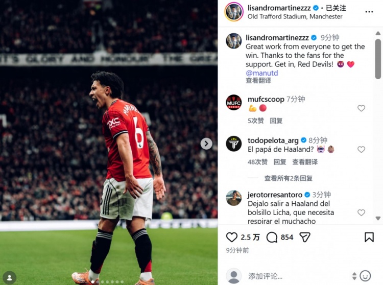 本場比賽利桑德羅發(fā)揮出色,限制了哈蘭德的表現(xiàn)。利桑德羅賽后在社媒曬出本場慶祝照,配文寫道:“每一個人都表現(xiàn)出色,這讓我們收獲勝利。感謝球迷的支持,紅魔加油!”
