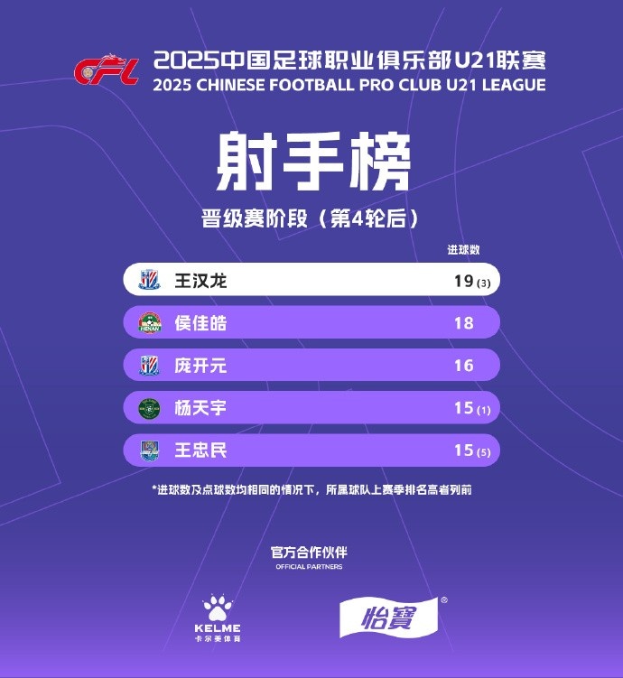 射手榜方面,上海申花U21球員王漢龍以19粒進(jìn)球排名第一,河南隊(duì)U21球員侯佳皓以18球排名第二。