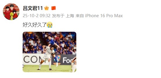 本場比賽海港老將呂文君在第64分鐘替補登場。他賽后更新了個人社媒,曬出本場比賽照并寫道:“好久好久了?!?/p>