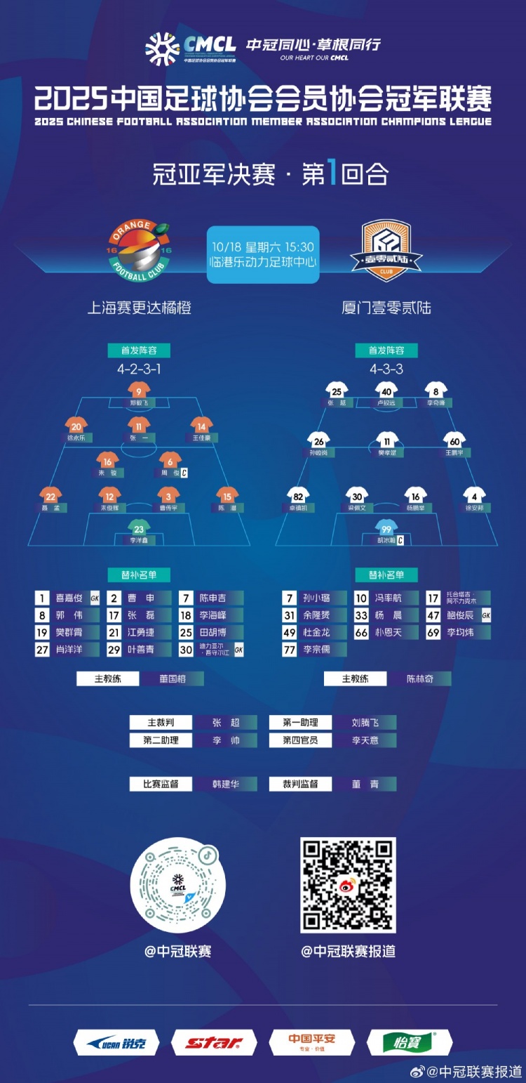 10月18日訊 今天下午15:30將迎來上海賽更達(dá)橘橙vs廈門壹零貳陸的中冠冠亞軍決賽首回合比賽,59歲的投資人朱駿代表上海賽更達(dá)橘橙首發(fā)登場。