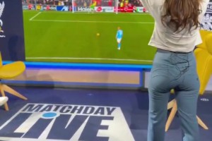 緊張!英國(guó)美女模特兼曼城電臺(tái)主持娜塔莉看哈蘭德點(diǎn)球