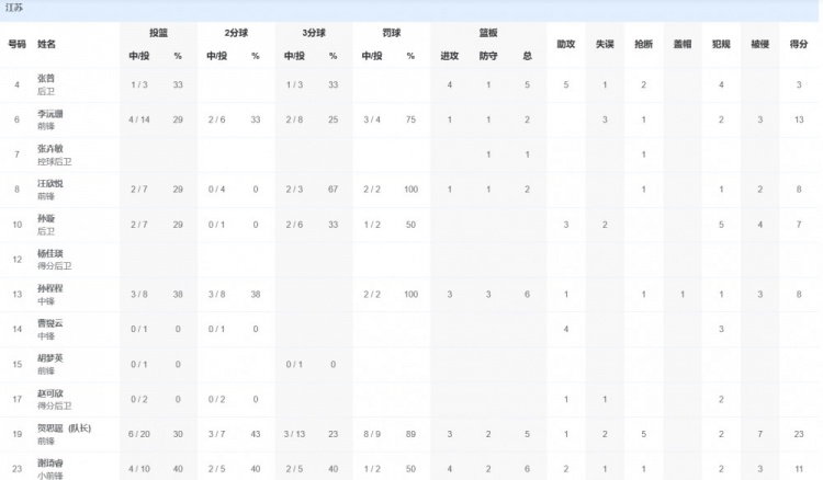 江蘇隊(duì)方面,賀思瑤23分5籃板1助攻5搶斷,李沅珊13分2籃板,謝琦睿11分6籃板2助攻。