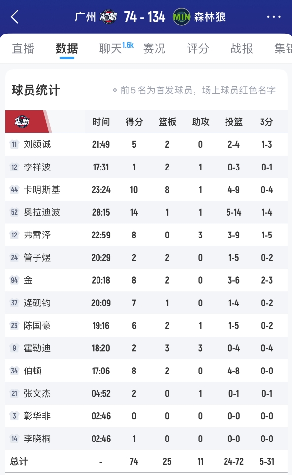10月14日訊 NBA季前賽,廣州74-134不敵二陣森林狼。全場(chǎng)廣州凈負(fù)60分,為其今年三場(chǎng)NBA季前賽輸球最大分差。