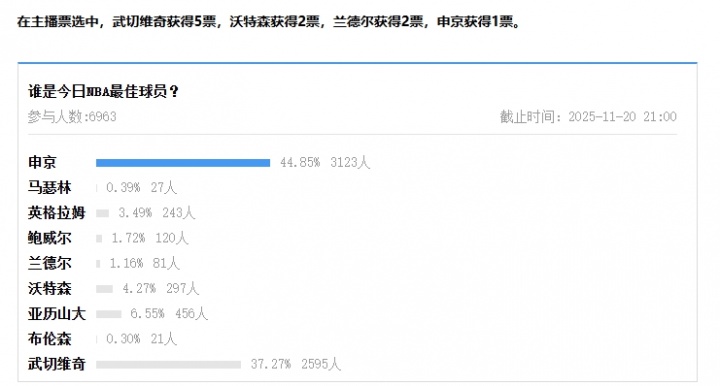 評選規(guī)則:候選球員由每場主播提名,吧友投票占比70%,主播投票占比30%,綜合占比最高者當選今日最佳。