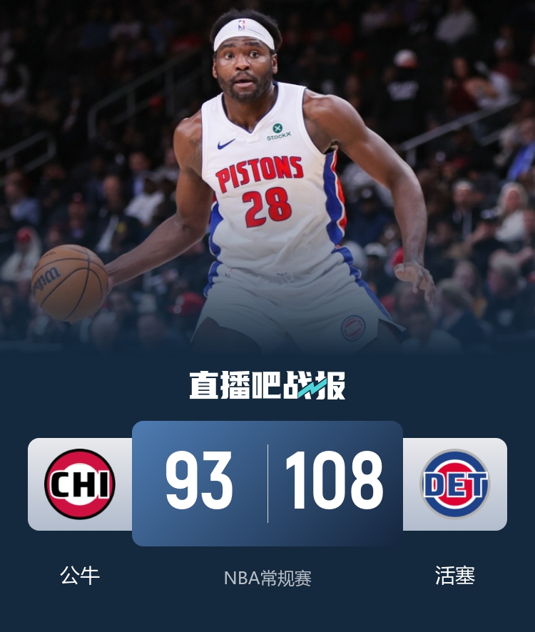 開場后公牛依靠布澤利斯的積極表現(xiàn)率先取得領(lǐng)先,不過隨后活塞就回應(yīng)攻勢完成反超,活塞連續(xù)沖擊內(nèi)線在第一節(jié)結(jié)束時(shí)建立領(lǐng)先。第二節(jié)上來兩隊(duì)命中率都不高,外線投籃都是頻頻打鐵,場上比分依舊十分膠著,活塞以2分微弱優(yōu)勢領(lǐng)先結(jié)束上半場。易邊再戰(zhàn),公牛外線率先找打手感連中三分將比分反超,活塞這邊迅速調(diào)整及時(shí)咬住比分。最后一節(jié)活塞上來連得7分完成反超,此后斯圖爾特內(nèi)線頻頻上演暴扣幫助活塞擴(kuò)大優(yōu)勢,公牛進(jìn)攻手感不佳,活塞將分差逐漸拉大到兩位數(shù),最終活塞108-93擊敗公牛取得3連勝,公牛遭遇3連敗。