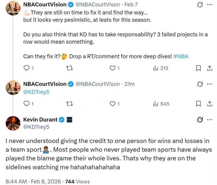 網(wǎng)友:他們(火箭)還有時間去修正并找到出路……但至少在這個賽季,情況看起來非常悲觀。你是否也認(rèn)為杜蘭特需要承擔(dān)責(zé)任?連續(xù)三個賽季的失敗意味著一些問題。他們能解決這個問題嗎?