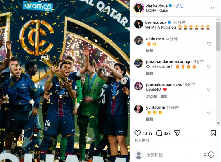 在社交媒體上,巴黎圣日耳曼邊鋒杜埃曬出捧杯照進行慶祝,他寫道:多么美妙的感覺!