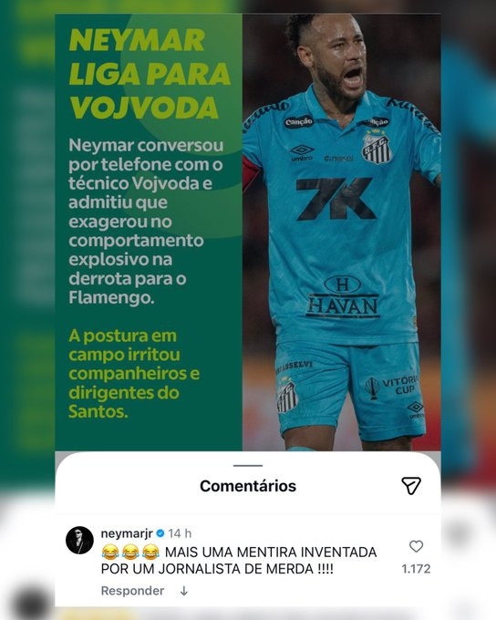 本輪巴甲聯(lián)賽結(jié)束后,有媒體報道稱內(nèi)馬爾曾主動聯(lián)系主帥沃伊沃達(dá),并承認(rèn)在輸給弗拉門戈的比賽中自己的過激行為確實(shí)過分。對此,內(nèi)馬爾在ge新聞網(wǎng)Instagram推文評論區(qū)直接回應(yīng):“這又是某個垃圾記者編造的謊言?!?/p>