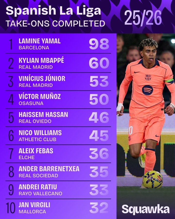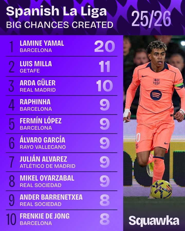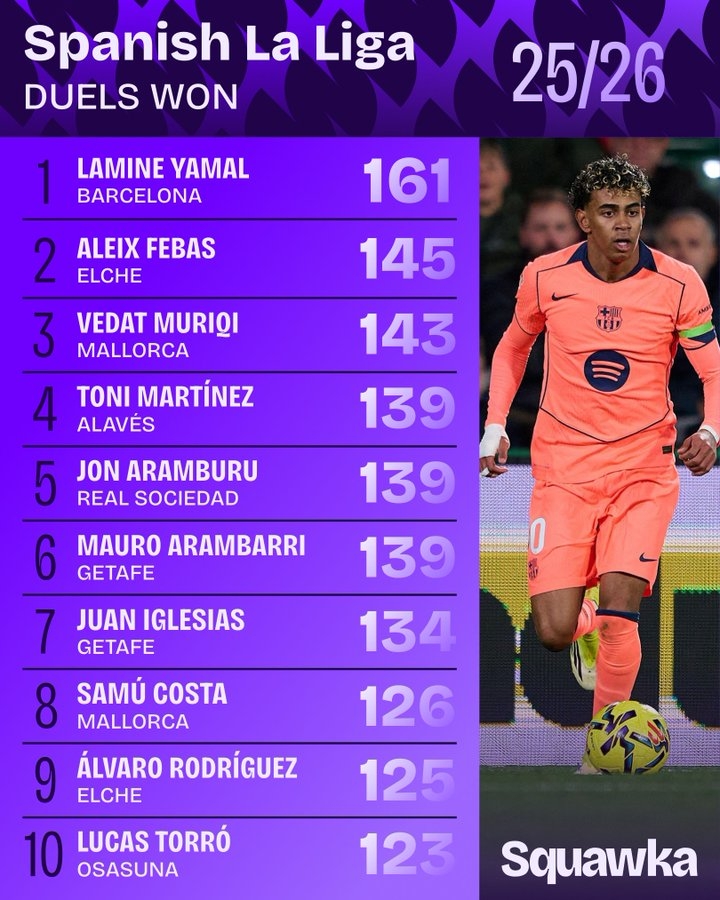 02月05日訊 截止西甲22輪,據(jù)Squawka統(tǒng)計,亞馬爾在多項數(shù)據(jù)霸榜。