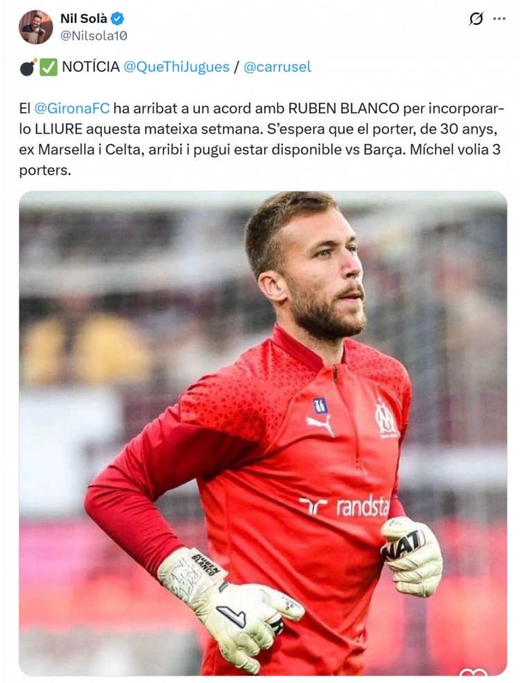 Nil Solà透露,由于特爾施特根受傷,赫羅納尋求引進(jìn)自由身門(mén)將,已與西班牙門(mén)將魯本·布蘭科就免簽事宜達(dá)成協(xié)議。