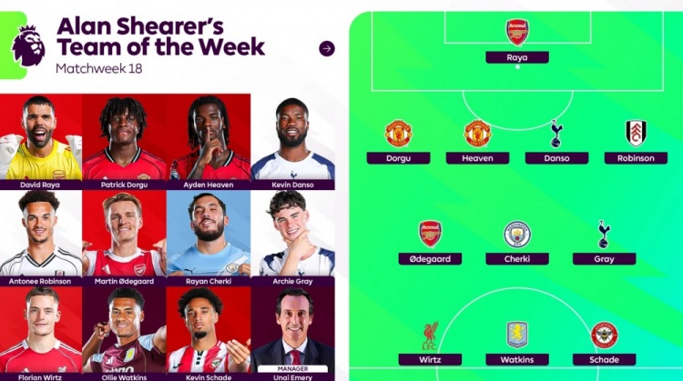 12月29日訊 英超第18輪戰(zhàn)罷,阿蘭·希勒評出本輪最佳陣,拉亞、維爾茨、厄德高、謝爾基在列。