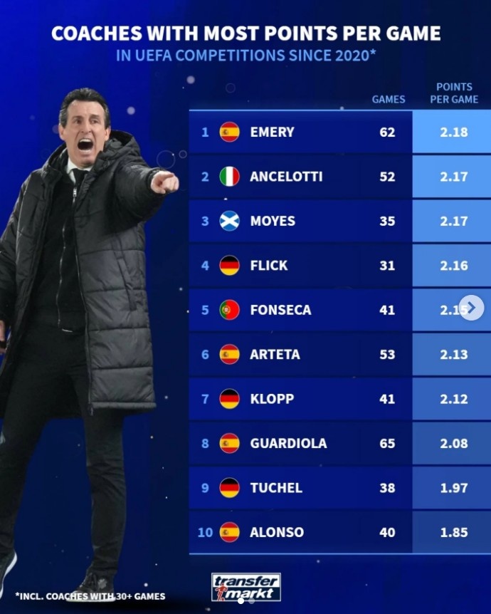 1月23日訊 本賽季維拉在歐聯(lián)杯表現(xiàn)出色,7戰(zhàn)6勝1負(fù),德轉(zhuǎn)也盤點(diǎn)了自2020年以來各位主帥在歐戰(zhàn)場均積分榜,其中埃梅里居首,具體如下(至少執(zhí)教30場比賽):