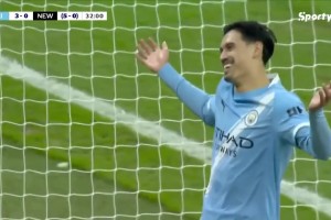 曼城半場3-0紐卡!紐卡解圍不遠,賴因德斯跟進推射破門!